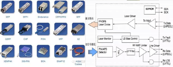 左圖為各類光模塊的不同形態,右圖為光模塊內部結構